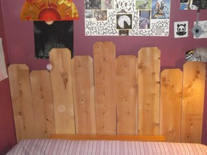 My amazing daughter and I were discussing how much we liked the cedar smell when we got the idea that we could use them to make headboards. I measured my bed and it was 60″ wide. PERFECT! 10 pickets! She measured hers and it was 54″ wide. 9 pickets! I was going to just leave them at 6 feet for a really tall headboard when my husband pointed out that we would never be able to open the window again. I tried to substitute my own reality that it would look great and who needs a window, but his reality won. Damn him. The kid came up with the idea that she could cut the bottom 2 feet off and make a foot board out of it. She is a brilliant little thing!