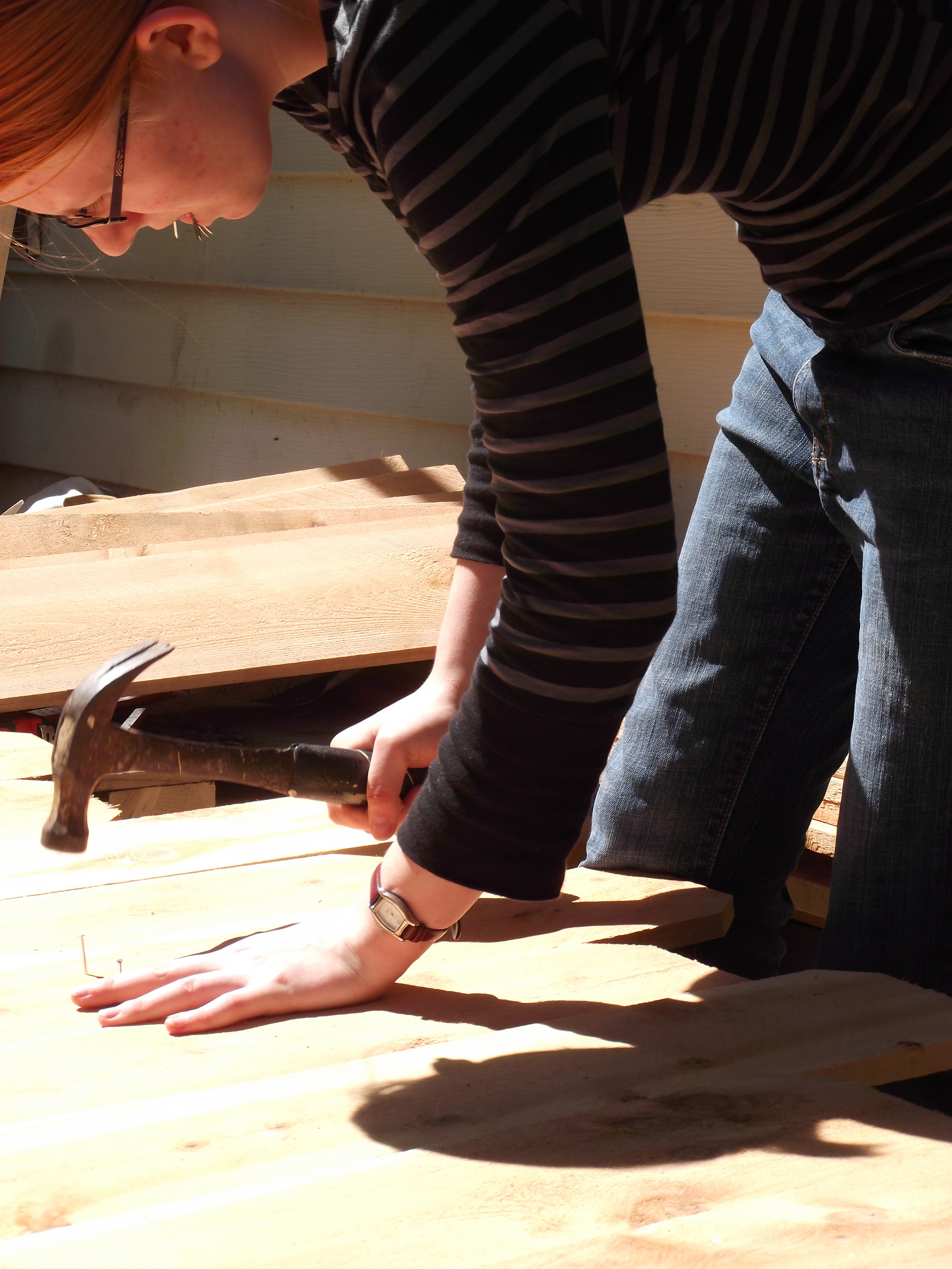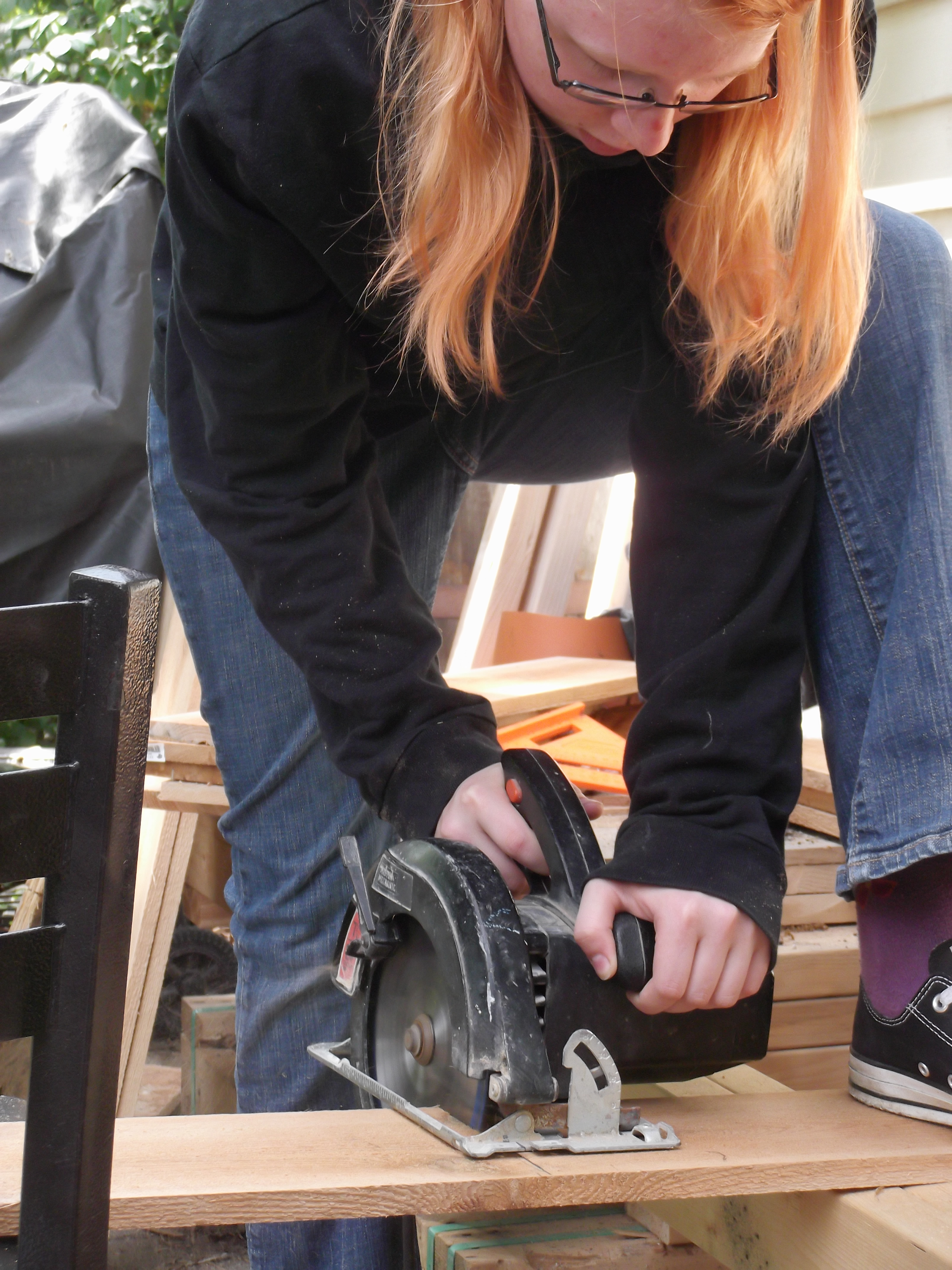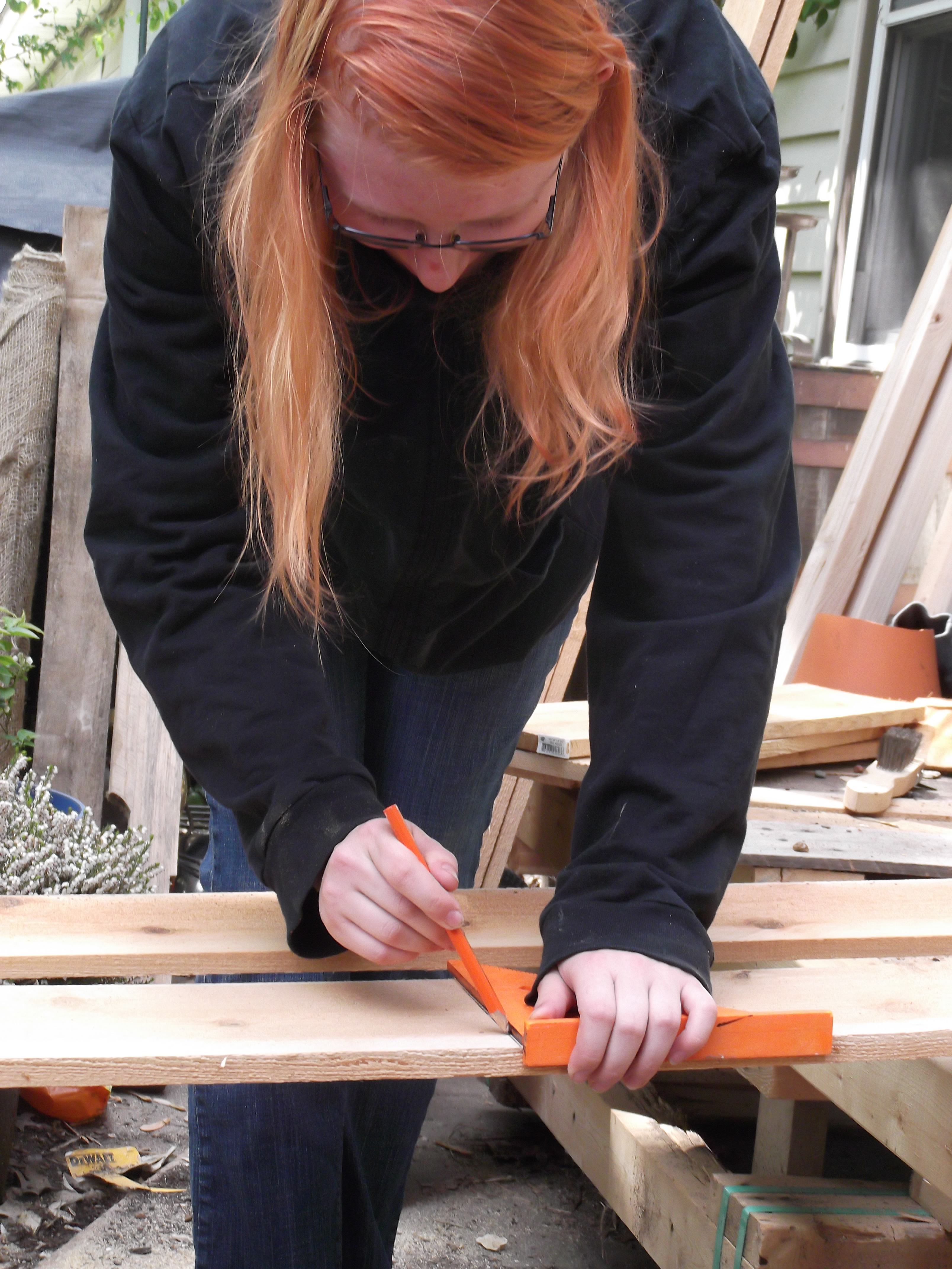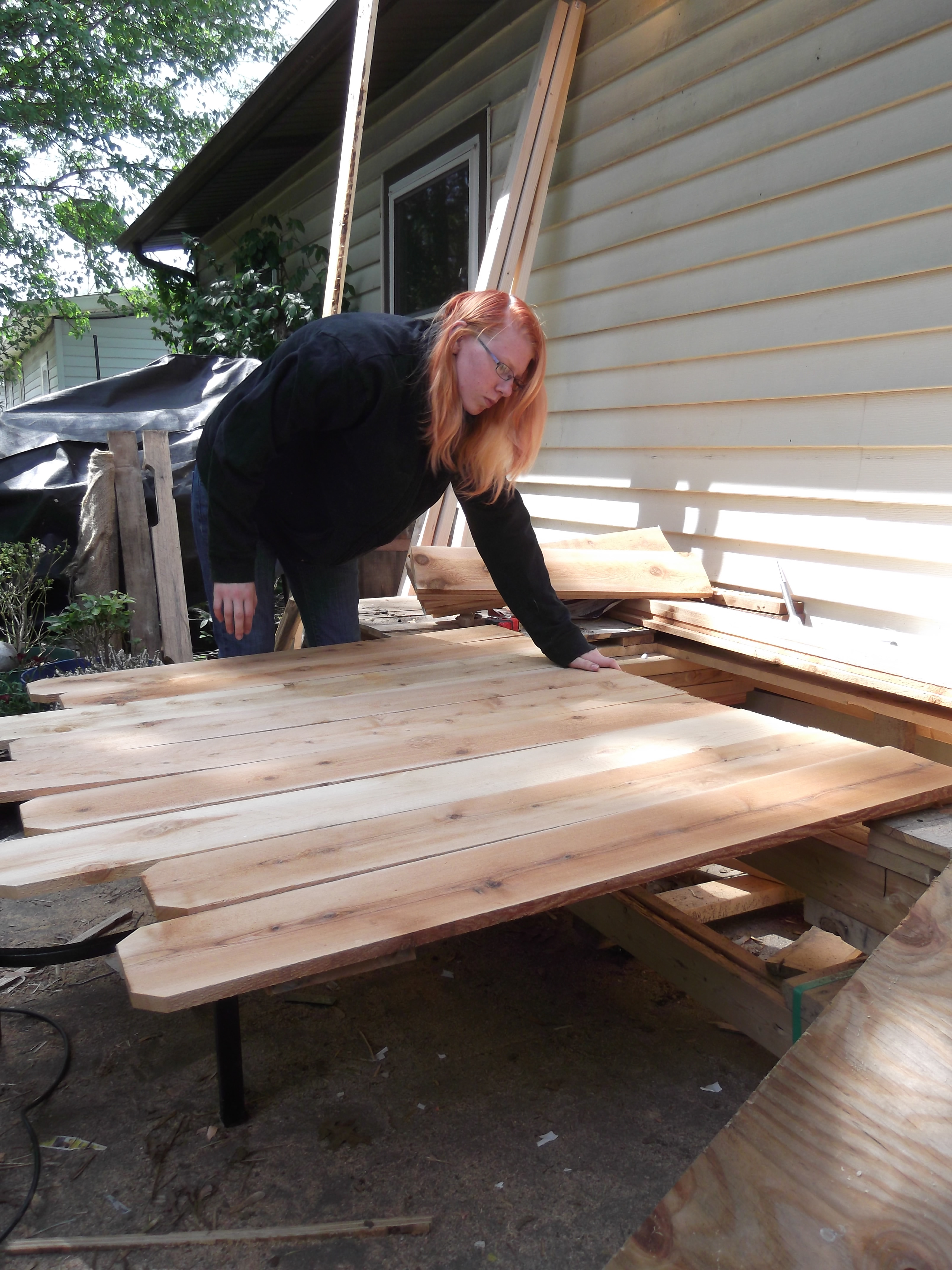The first thing she did was sort through the cedar pickets and find ones she liked. She was looking for straight ones that weren’t ragged on the ends and had “character.” She used a tape measure and a square to mark all of them at 24″ from the bottom. Then, she cut all of them at the 24″ line with a circular saw and stacked them into two piles by length. Using a bench that she and her step sisters have been building as support on one end and a chair as support on the other, she laid out two pickets that would be the horizontal cross support and frame for the headboard and footboard.