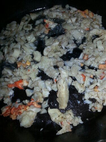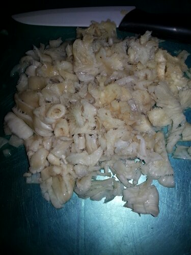 This is one of the little clusters we found. It was pretty close to 3/4. The other one was about 1/2 a pound. I washed them really well since there is a little beetle that seems to ONLY live in the oyster mushroom. Then I chopped them like this.
