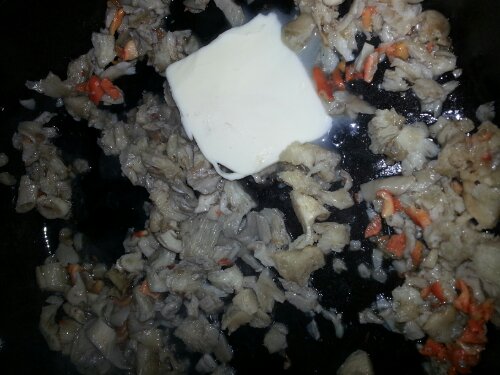 Cook until the butter is melted, on low heat. Stir to make sure the butter is evenly distributed then add about 1/4 cup of flour. Spread it evenly over the mushroom mixture. Then add salt and pepper to taste.