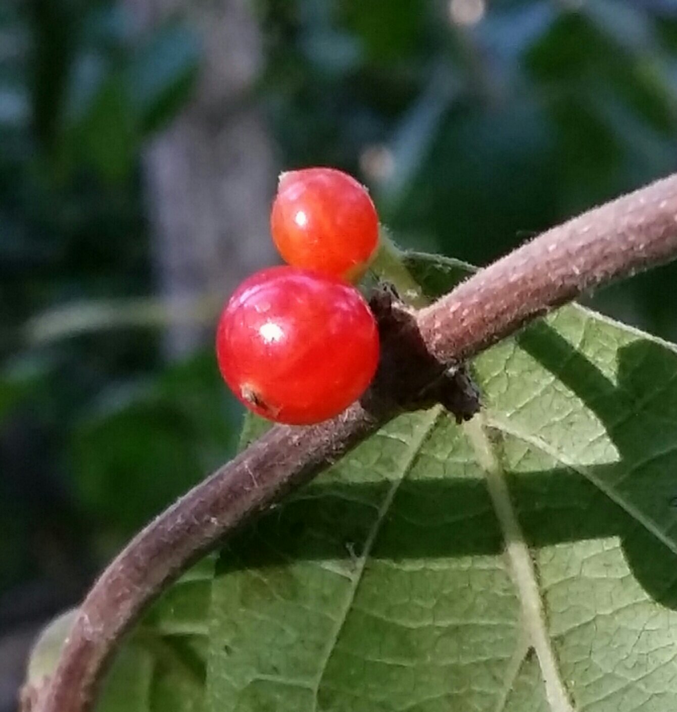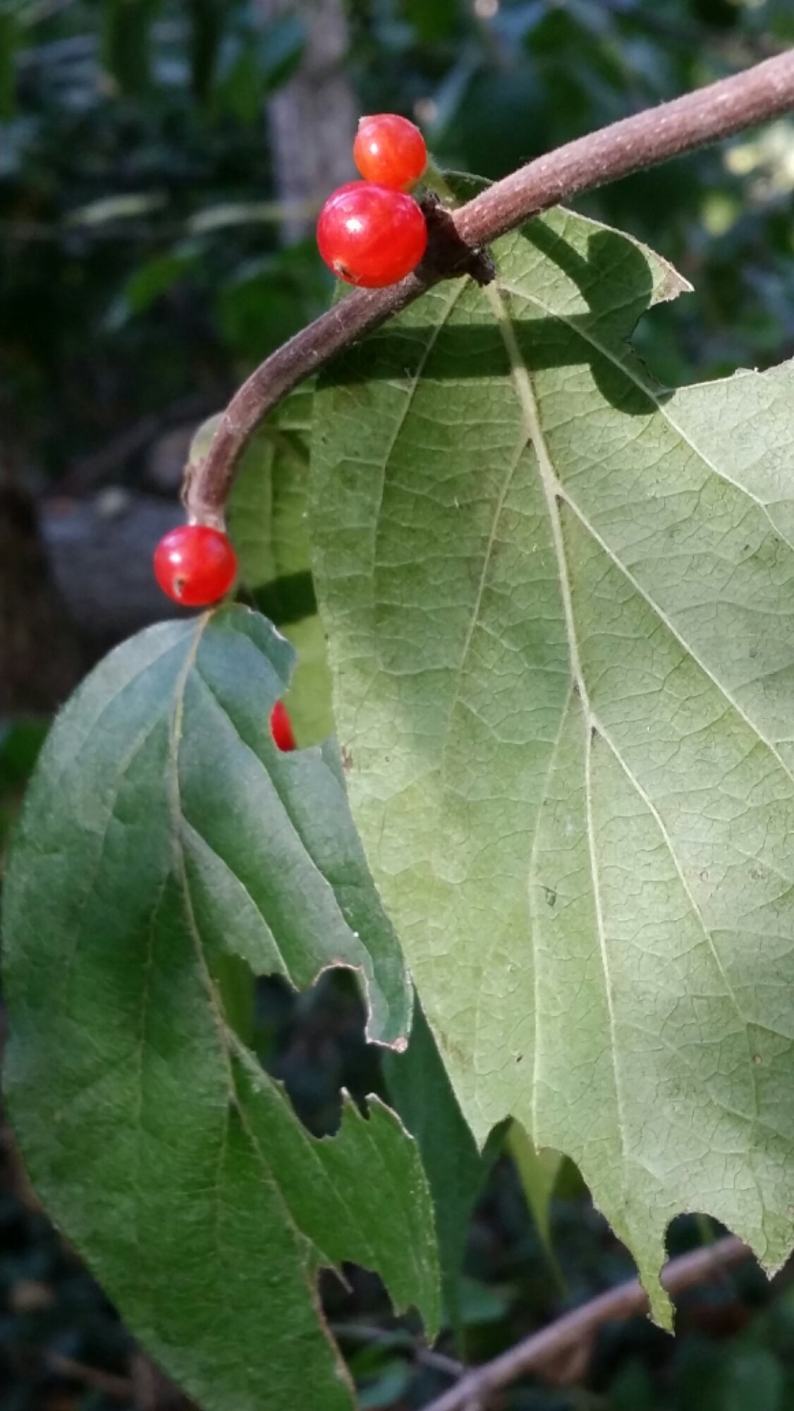Why do I hate Honeysuckle so much? Because it is slowly smothering the woodlands. It chokes out native species, disrupts the fauna and flora and depletes the soil. It is a menace. While the Autumn Berry is ALSO invasive, it isn’t as bad. It also, much like legumes, is a nitrogen fixer; it actually puts nitrogen back into the soil. While this too can disrupt native flora and fauna, it can help repair some of the damage Honeysuckle does. In the photo to the right you can see that the leaves look very similar to the Autumn Berry but there are differences. The leaves are much wider, and are more green on the obverse side. They are generally larger leaves overall. They aren’t as smooth and waxy feeling as the Autumn Berries. The stems are a bit fuzzy on the Honeysuckle. The berries form on the top of the branch. The berries are VERY glossy red. They are blemish free and don’t have stems.