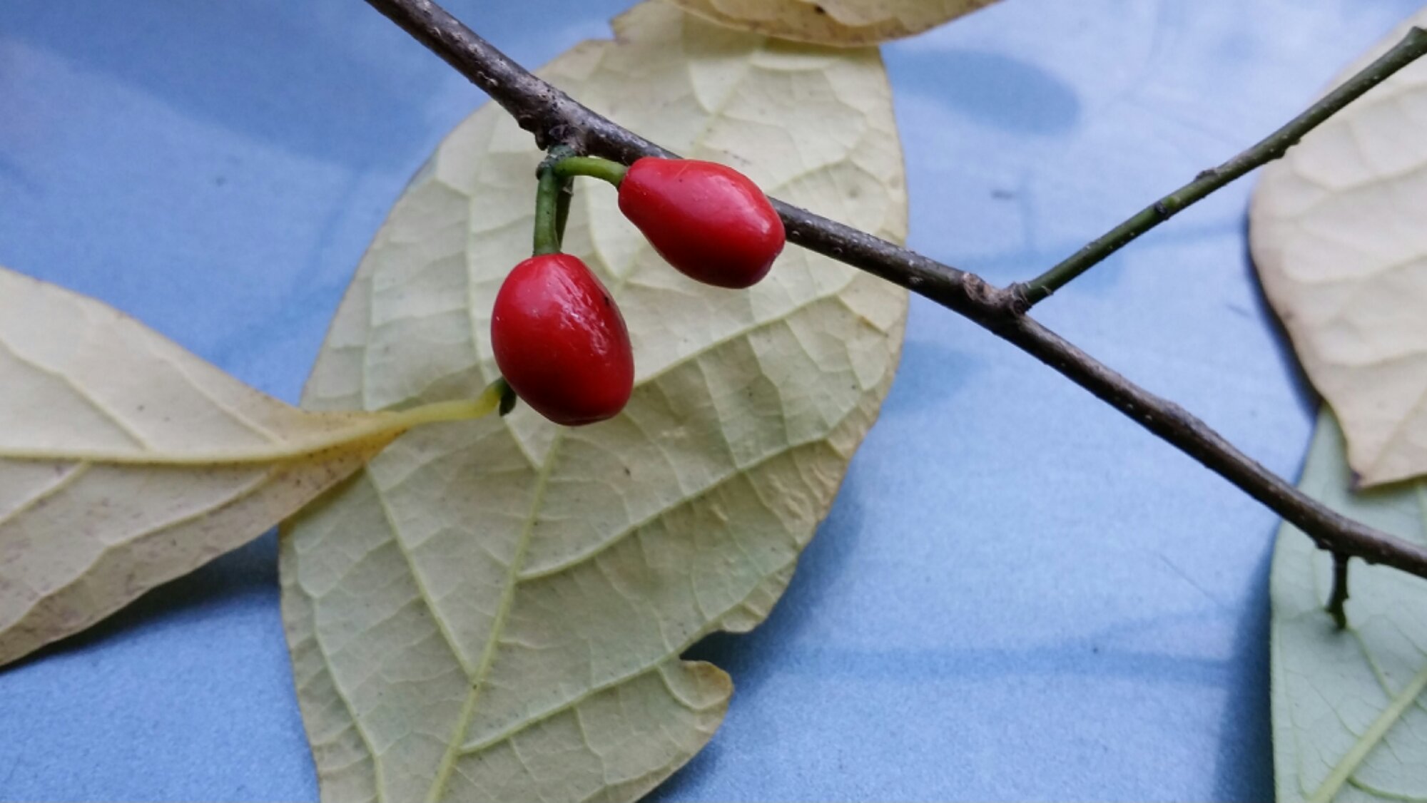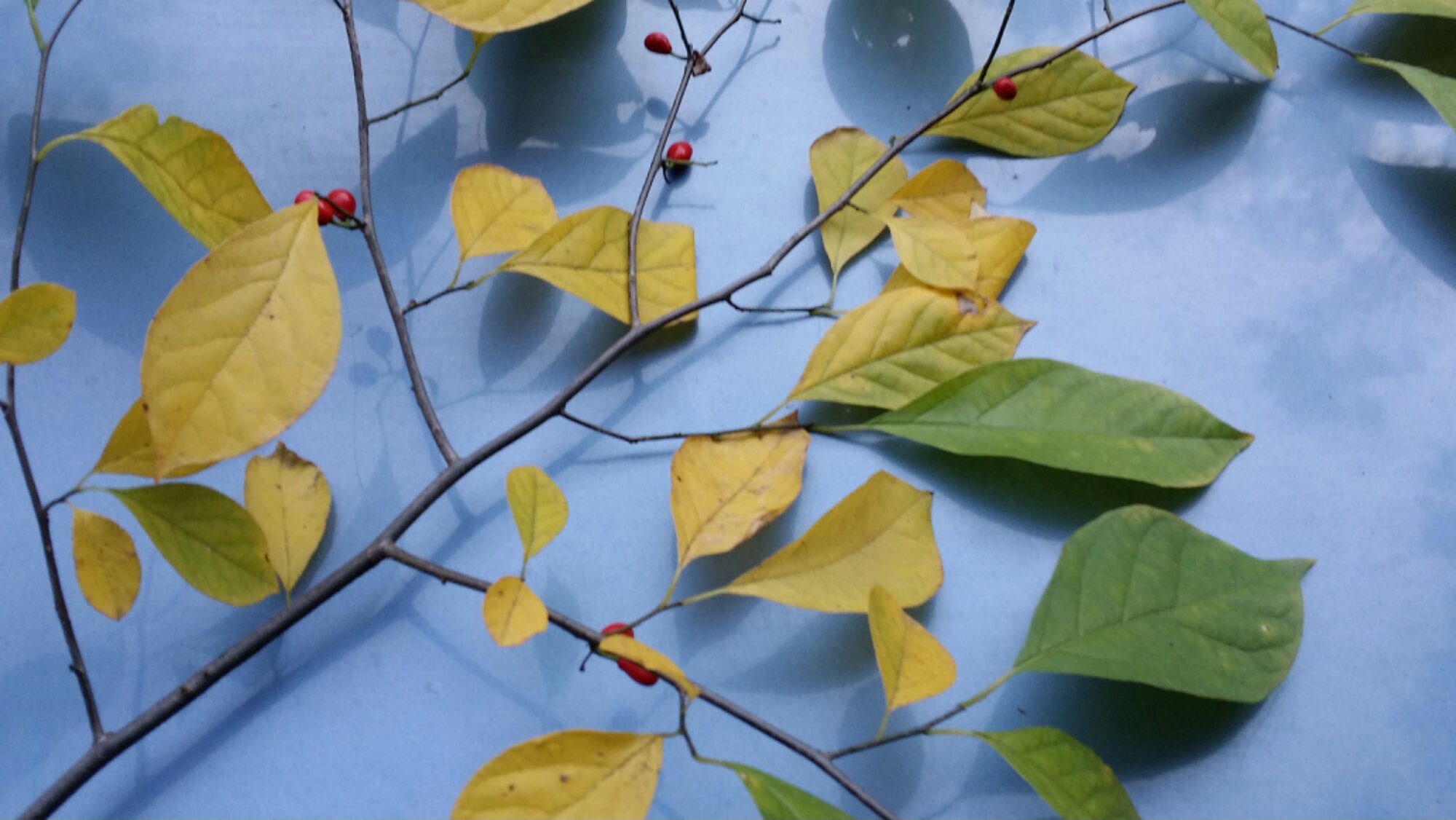 Spicebush turns a beautiful orange color in the fall and has distinct red fruit with huge black seeds inside.