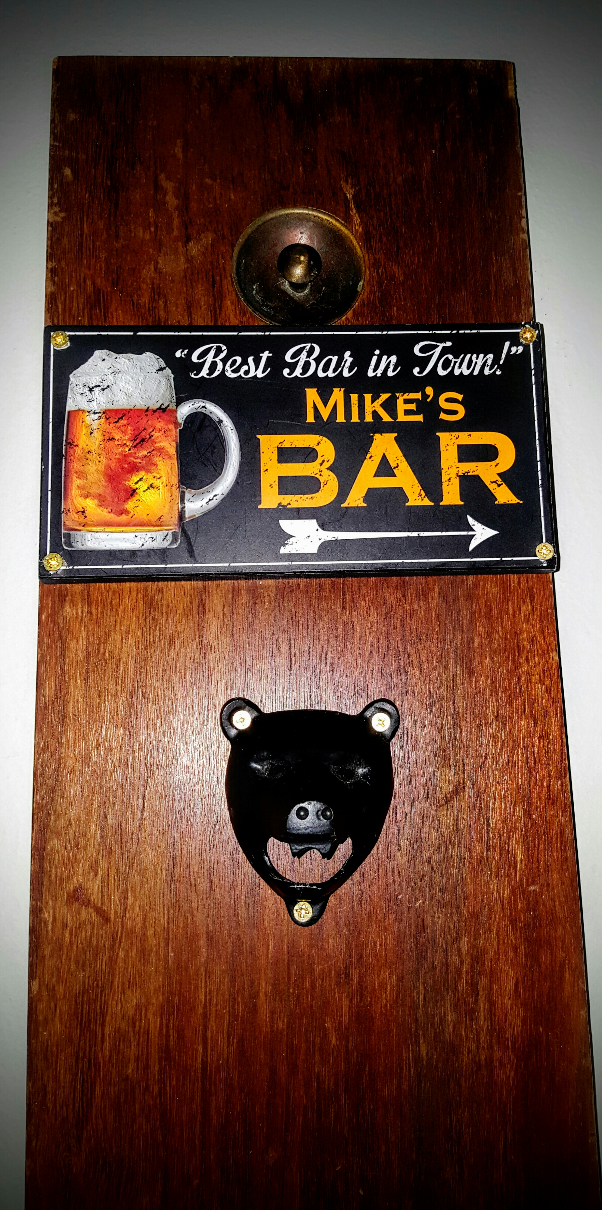 Several years ago I found the “Mike’s Bar” sign in a tourist shop in North Carolina. We were on vacation, it was small, and it made me think of when he has his friends over for a few beers.  I bought it and gave it to him as a holiday gift that year.  Last year, I found the bear head bottle opener, at Target of all places, around the holiday season and gave it to him as well.