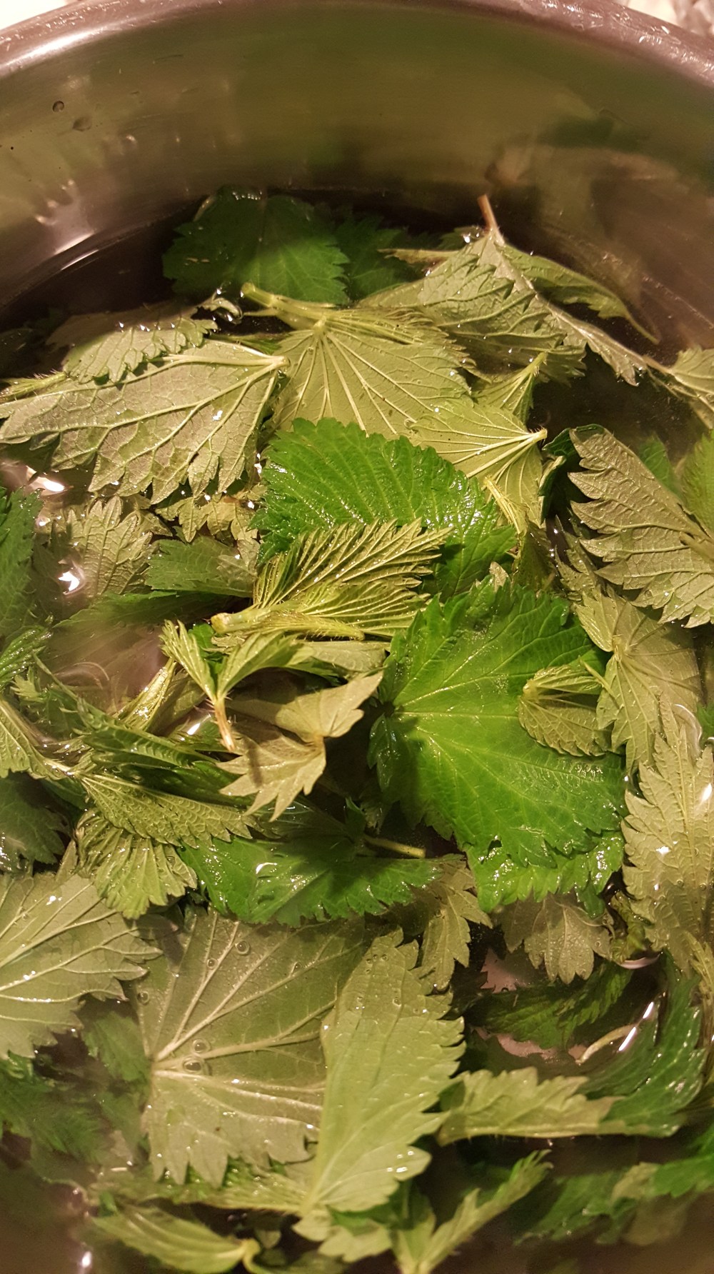 The first thing I did was snip the leaves off the nettle. I managed to harvest and prepare the whole mess with only a quick sting to my lip when I was sniffing the leaves. It smells somewhat like basil and something else and I can never quite put my finger on what. I had a lot too cook, so I put it in water to cover and add a ¼ c of salt or so. Simmered until the leaves changed color, then I put on ice or it becomes slime.