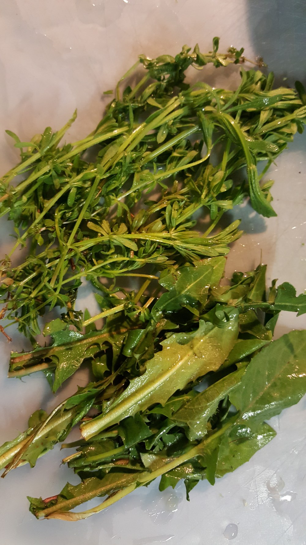 The dandelion greens and cleavers got washed and picked through pretty well. I harvested both in Hemlock territory and that is not something you want mixed in with your food.