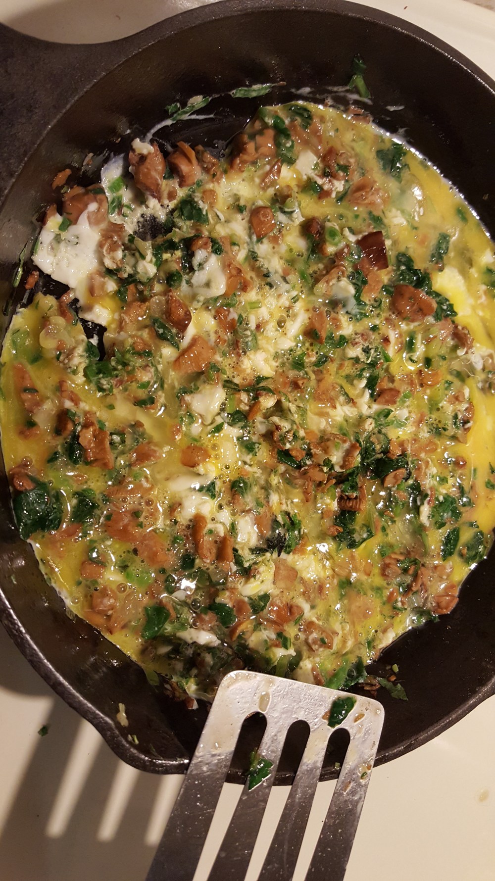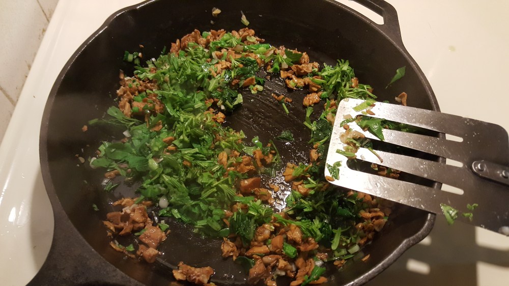 Once all of my ingredients were roughly the same size and my nettle had cooled enough that I could chop it, I heated a cast iron skillet to temperature, then I sautéed everything in a tablespoon or so of olive oil.
