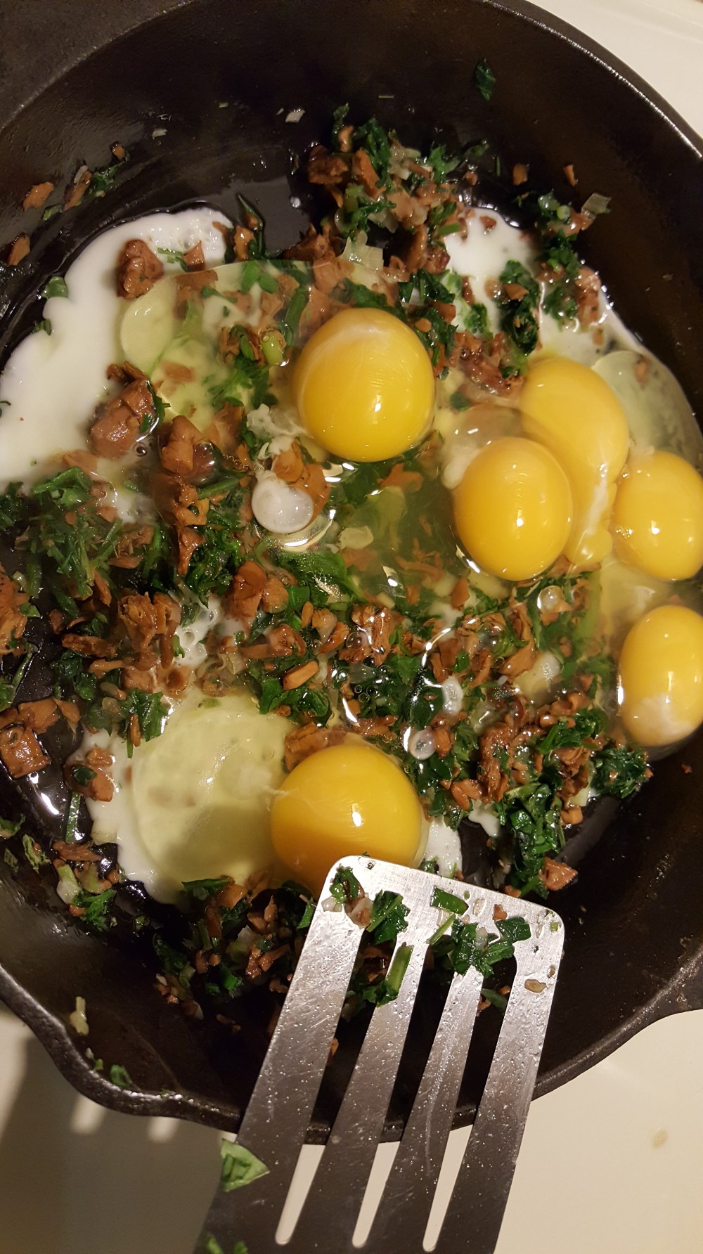 Once everything was about ¾ of the way cooked, I added six eggs. This is when you REALLY have to exercise patience.