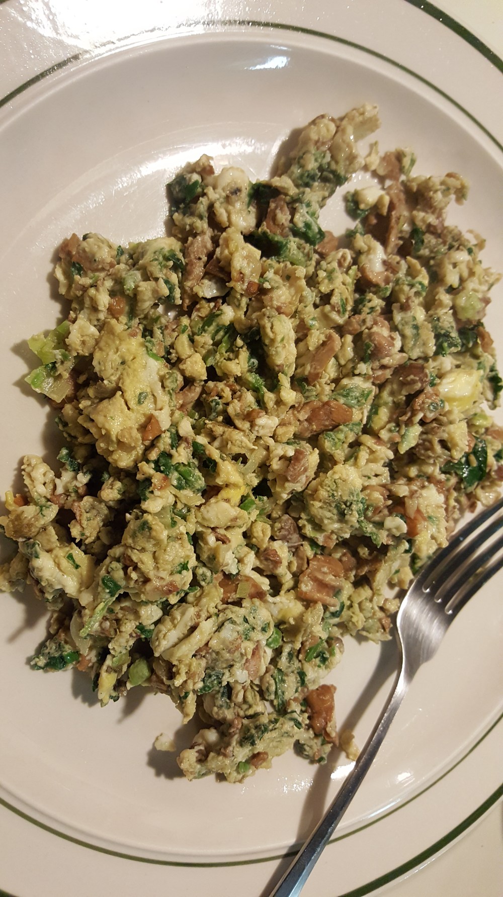 Every few minutes give it a quick stir so the eggs cook into lovely scrambles around the other ingredients. When the eggs are fully cooked and the ingredients are evenly distributed throughout, its done.