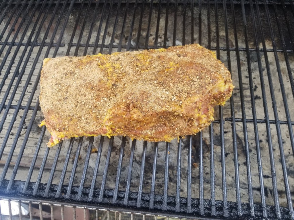 Put all of the dry ingredients in a spice grinder and turn it into a powder. Then whisk half of it into the honey. Use a brush, or your hands to smear it all over the brisket (I used the point). Sprinkle the rest of the rub over the honey mustard smeared brisket.
