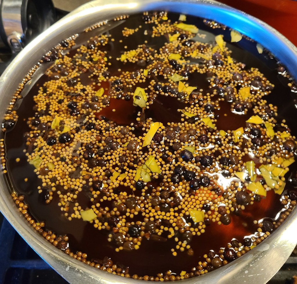 I prepared the brining mix first, and pulsed it in my food processor a couple of times. Mostly just to dust off the exterior oxidized surface of the spices. I find that if nothing else, it makes them more aromatic. I put the mix into a large stock pot to which I added the salts, and water. I brought it to a simmer, turned it off and then let it come to room temperature. This was to make absolutely certain that there was nothing alive, though I was probably being overly cautious. With that level of sodium, if there was anything alive it deserved to be studied somewhere.
