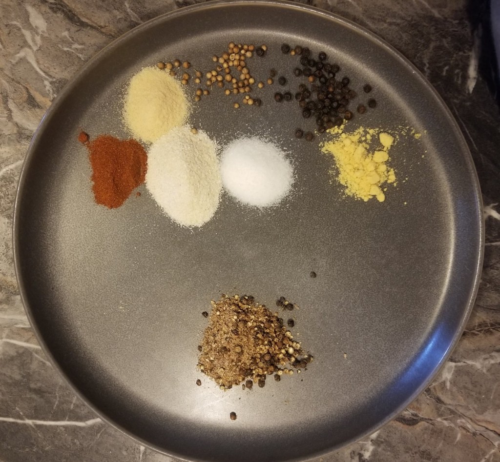So the flat was left as corned beef and demolished for dinner. That wasn’t so much the plan, it just sort of happened. The point got wrapped in foil and put in the refrigerator over night. I prepared the pastrami rub and put it in the refrigerator overnight, as well. Those ingredients are below.