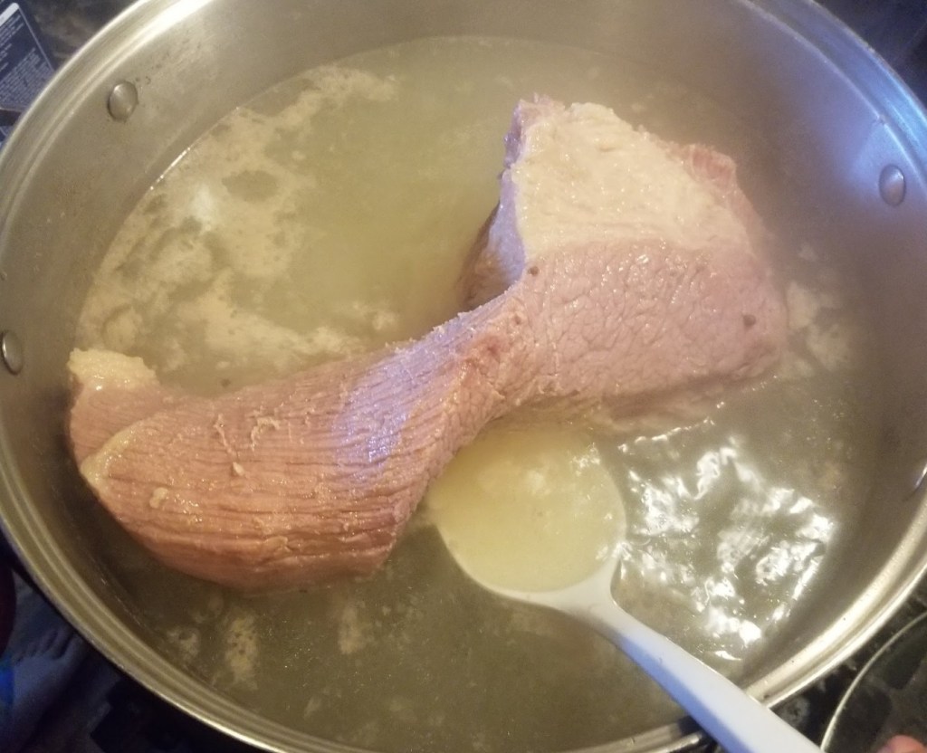 I put both in a large stock pot, and covered them with water and then boiled them for 4 hours. At the end of the four hours and repeated meat thermometer stabs showing a 165° internal temperature (yes yes yes I know, too hot, I murdered it, yadda yadda yadda) I removed them from the pot and let them rest. At that point, I had two corned beef briskets. I had to taste test them to be certain they weren’t poison. A few times. Then I got caught. So I bribed my husband by having him taste test it to make sure it wasn’t poison. Can’t be too careful, you know.