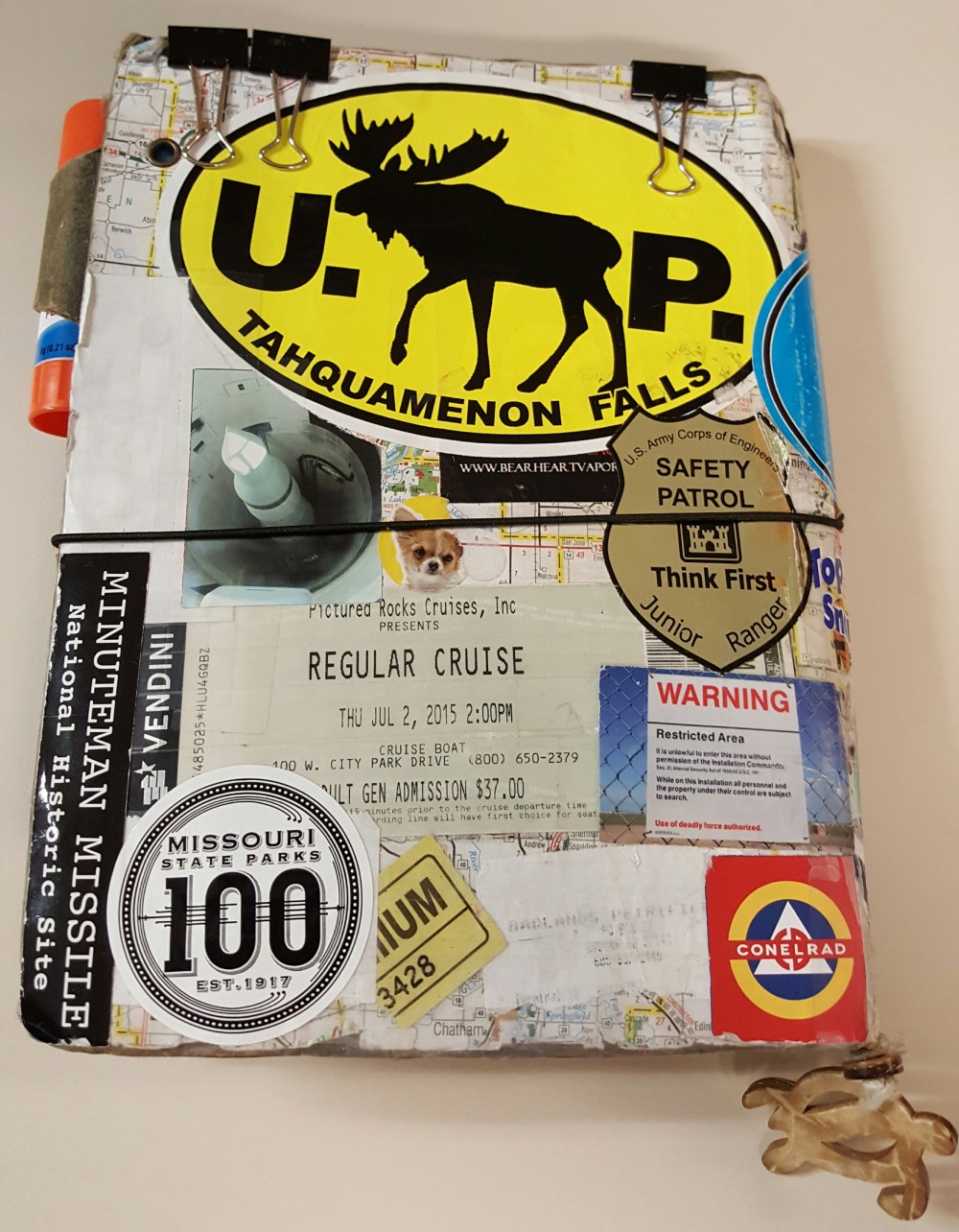 I have changed it a lot since I first made it. I slimmed it down considerably, and figured out what worked for me. One of the big changes I made was that I started putting stickers, and ticket stubs on the cover. It has become a visual reminder of all the places I have been.