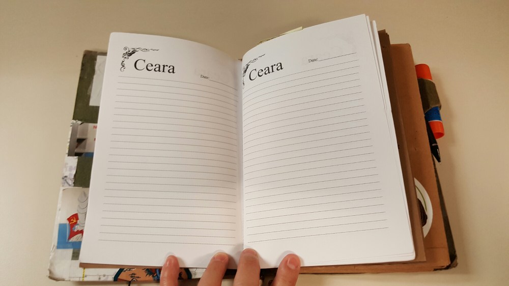 Also, if you can use Microsoft Word, you can make your own personalized journal pages. If you are word savvy, flip the orientation to horizontal, and make it two columns. Then find a clip art border for the upper left hand corner. Use word art to put your name on it. Tab over a few places to put the date field, and use the underscore about 15 times. Enter to the next line and just underscore the hell out of it until you get to the bottom. Copy that column, and past it in the second column. Bam. Print 10 of those, flip them in the printer to print 10 more on the other side and you have a book.