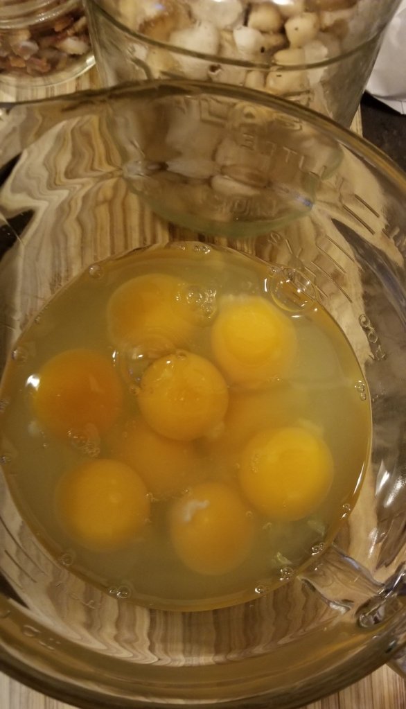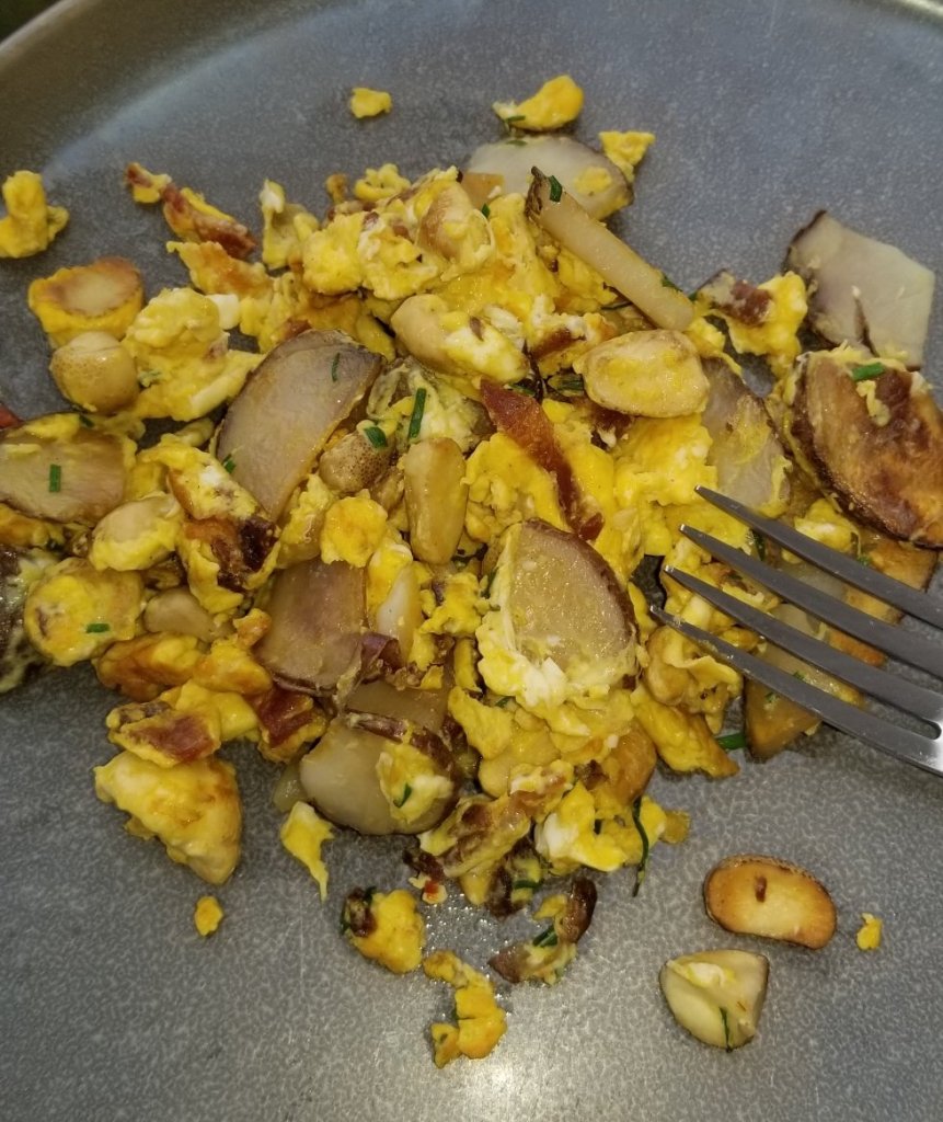 I whisked my eggs in the measuring cup and slowly poured it into the potatoes, bacon, and puffballs. Stirring slowly, scramble the whole mixture.