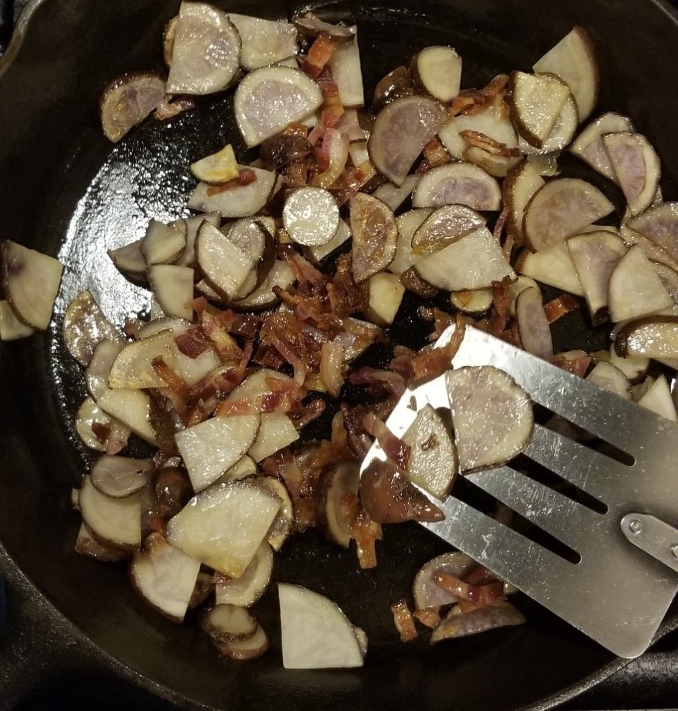 After I had everything ready to go, I started the potatoes in a cast iron skillet using saved bacon renderings. I cooked them until they were tender, and then added the 8 ounces of prepared bacon.